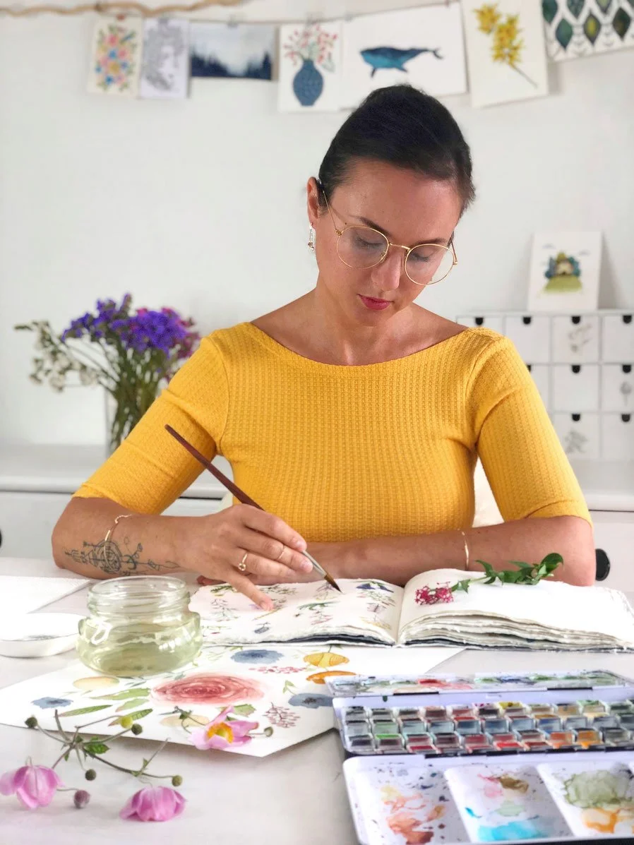 Today, Monica Schick works primarily with watercolors, illustrating for clients, licensing her artwork, and sharing her creative journey with a growing community on Instagram. Her art is an invitation to pause, to experience the beauty of nature with all senses, and to find a moment of stillness in everyday life.